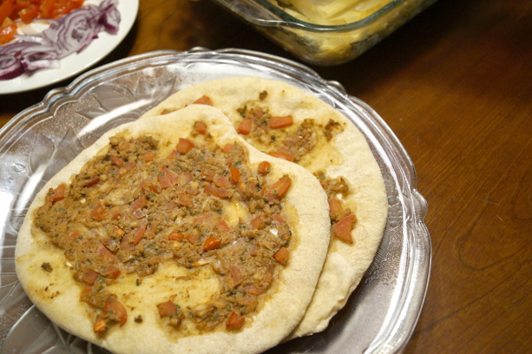 Directions Prepare the pita bread recipe. Combine diced tomatoes wtih finely diced white onion, and mix together with meat, parsely, spices and salt. Let mixture sit for at least 30 minutes while the bread is rising so that flavors combine. Roll out pita bread balls as thin as possible, and spread a thin layer of the the mixture over the dough. Cook at 450deg for 7 minutes. If you weight a few minutes before eating, or stack them for a few minutes, they will become more soft as the moisture from the center flows outward toward the dry crust. However, it's often hard to wait. Serve with yogurt garlic sauce, thinly sliced red onion, tomatoes, and thinly sliced cucumber. Place these on top and fold the lamajun like a taco and eat. Drips of lemon juice on top also enhance the flavor. ![]() |